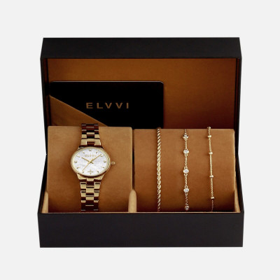 طقم هدايا نسائي من ماركة إلڤي مكون من ساعة وثلاث اساور باللون الذهبي ، الساعة بسير من الستيل بلون ذهبي بتصميم كلاسيك ، ساعة بميناء باللون الأبيض الصدفي ، يتزين الميناء بنقوش وزخارف ، الاساور بتصميم راقي وناعم باللون الذهبي يمكنك الاختيار بينهم او ارتدائهم معا ، ارتدي الطقم كامل لإطلاله مفعمه بالأناقه والرقي . ضمان سنة
