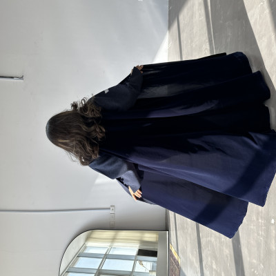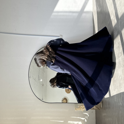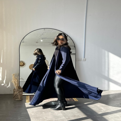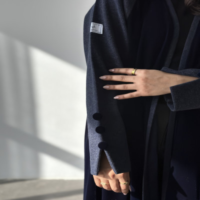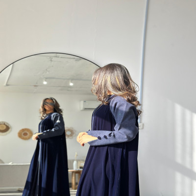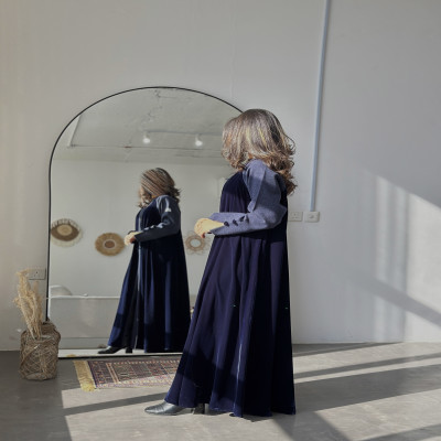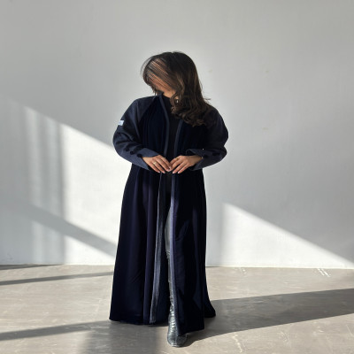 الزاهية A عباية كلوش من المخمل الراقي باللون النيلي مع تدخيله خام الجوخ الملكي على الاكمام ، وبقصة انيقه في نهاية الكم