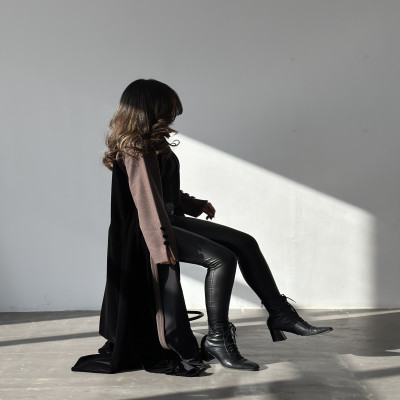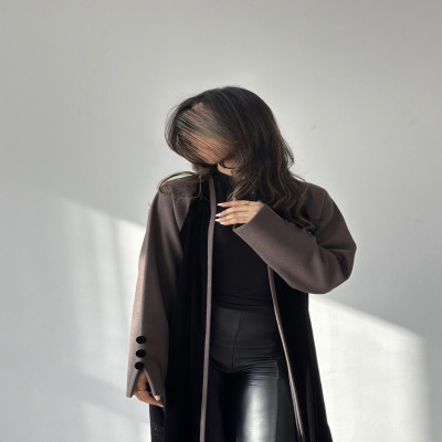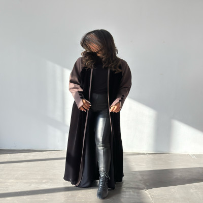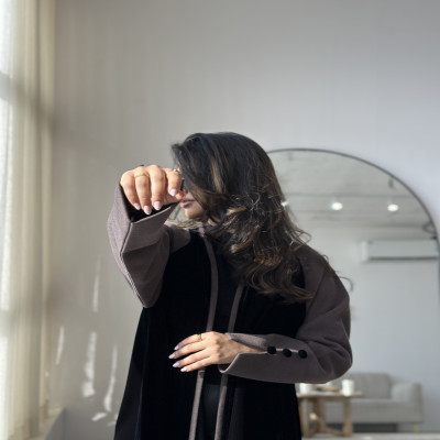 زاهية C عباية كلوش من المخمل الراقي باللون الاسود والكاكي الغامق مع تدخيله خام الجوخ الملكي على الاكمام ، وبقصة انيقه في نهاية الكم