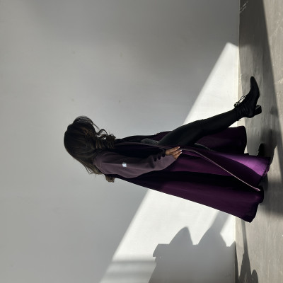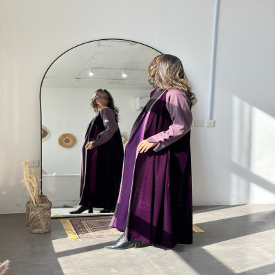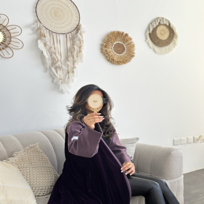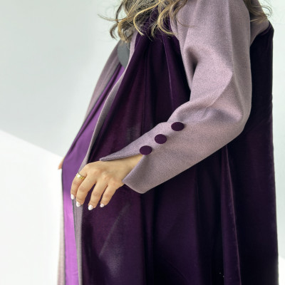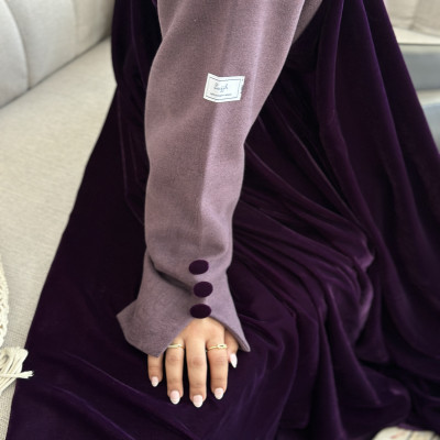 الزاهية D عباية كلوش من المخمل الراقي باللون البنفسجي مع تدخيله خام الجوخ الملكي على الاكمام ، وبقصة انيقه في نهاية الكم