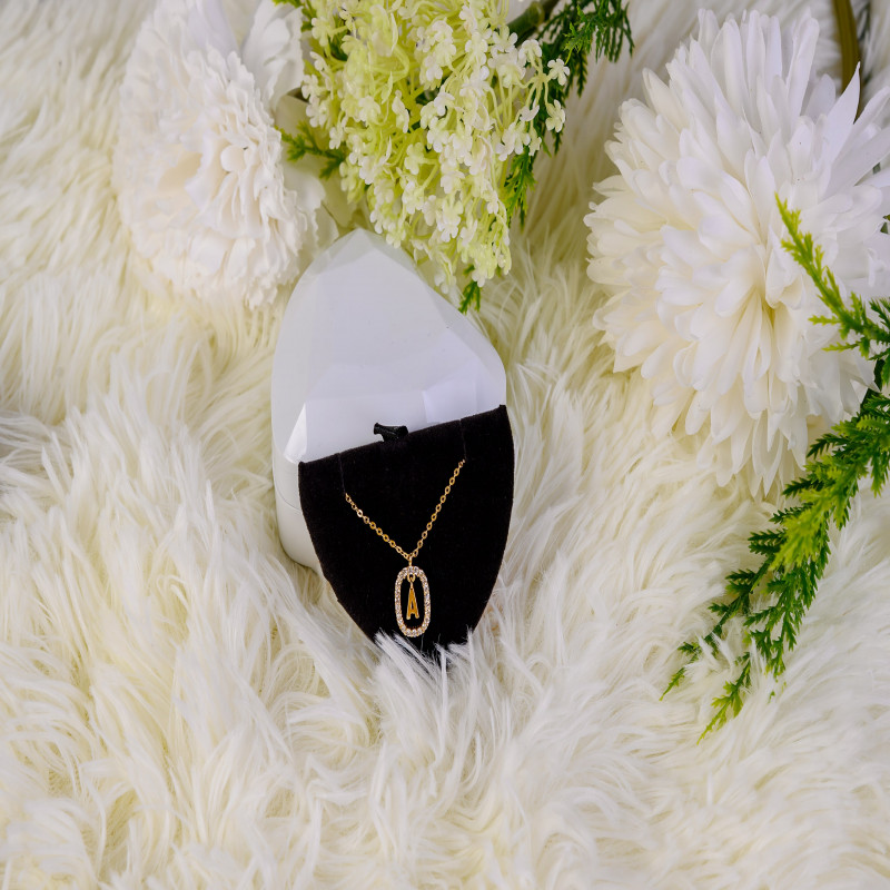 قلادة فضية مطلية بالذهب تحمل حرف من تحب. السلسلة مطعمة بالزركون وستبقى جميلة بمرور الوقت.