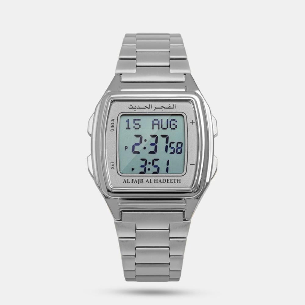 ساعة الفجر الحديث سنقل مصنوعة من الستانلس ستيل باللون الفضي وشاشة بيضاء