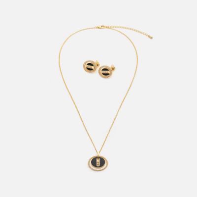 طقم نسائي بتصميم كلاسيك باللون الذهبي يتكون من سلسال وحلق ، يتميز الطقم بتصميمه الذي يتزين بحليه بشكل دائري مفرغ يتزين بفصوص من الزركون اللامع وبحلية بلون أسود ، نسقي الطقم مع إطلالتك المسائيه في المناسبات المهمه لتحضي بإطلاله ساحره وأنيقه .