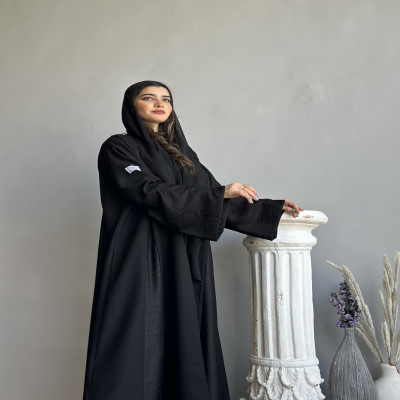 عباية رويال بلون اسود ملكي وقماش كتان مشجر على الاكمام وجوانب العبايه من الامام والخلف