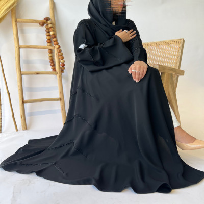عباية غنج بقصة كلوش و بخامه ناعمه ،مزينة بكرستال على اطراف واكمام العبايه