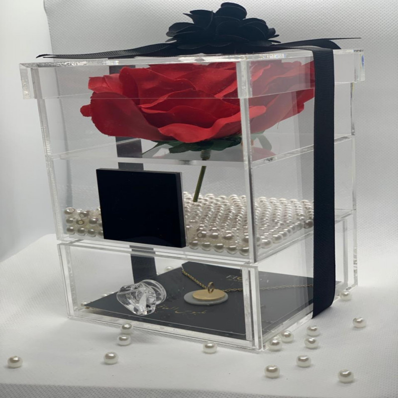 • مطلي ذهب عيار 18 جرام ، مع بوكس من الأكريليك المطعم بالورد واللؤلؤ.