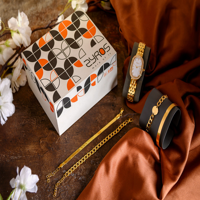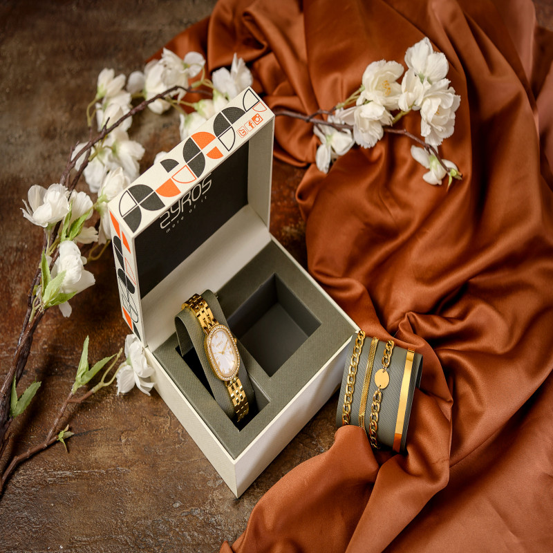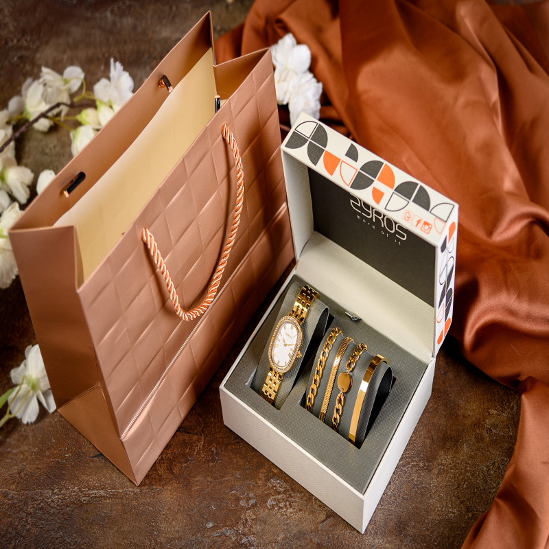 هذه الهدية النسائية الأنيقة المطلية بالذهب والمكتملة بساعة عصرية وأساور مميزة للحياة اليومية ستجعلها تشعر بالتميز.